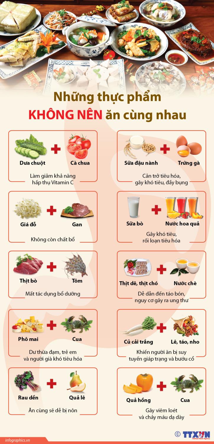 Một số món ăn kỵ nhau: · 2. Không nấu gan động vật với cà rốt, rau cần · 3. Không ăn dưa chuột với cà chua. · 4. Sữa đậu nành và trứng gà: · 5. Sữa bò và nước hoa …
