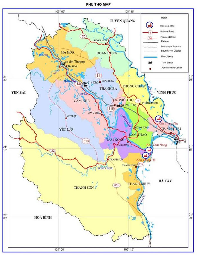 Phân cấp hành chính, Diện tích (KM2), Các công ty quan trọng. TP. Việt Trì. TX. Phú Thọ. H. Cẩm Khê. H. Đoan Hùng. H. Hạ Hòa. H. Lâm Thao. H. Phù Ninh.