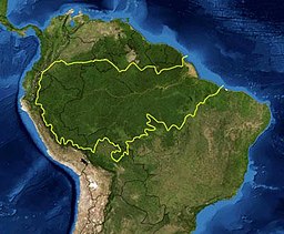 Bản đồ khu vực sinh thái rừng mưa Amazon theo định nghĩa của WWF. Đường màu vàng là đường bao quanh gần đúng rừng mưa Amazon (bỏ Venezuela và Guyana cùng …
