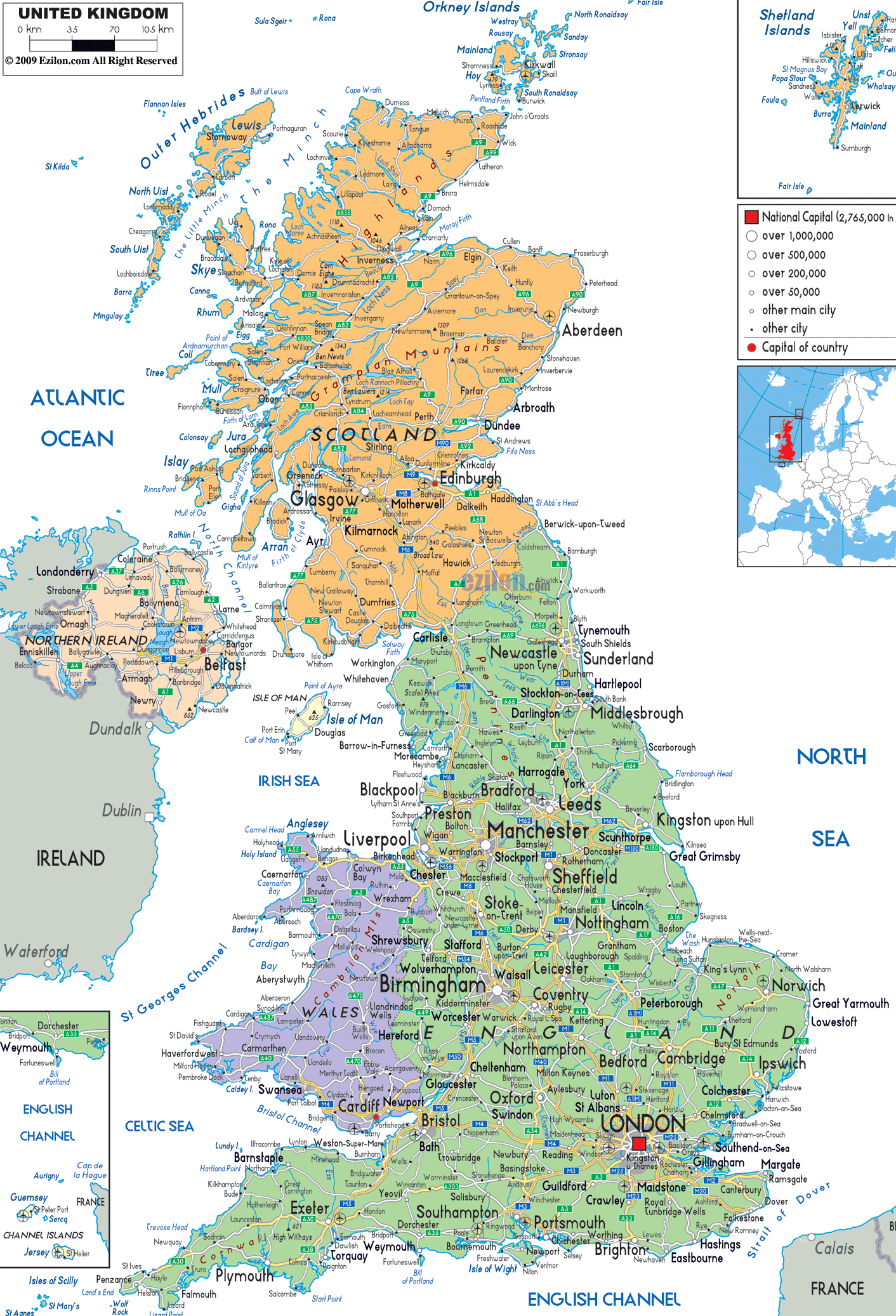 A political map of United Kingdom showing major cities, roads, water bodies for England, Scotland, Wales and Northern Ireland.