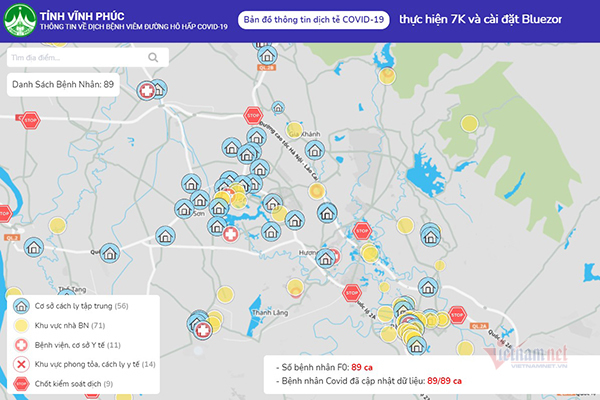 Vị trí bản đồ. Địa điểm xét nghiệm COVID 19 (23). Điểm cách ly tập trung (38). Khu vực nhà BN (124). Bệnh viện, Trung tâm Y tế (7). Khu vực phong tỏa, …