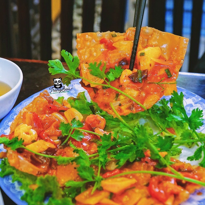 Để làm nước sốt rưới lên vỏ hoành thánh trong món hoành thánh chiên ở Hội An, người ta thưởng sử dụng cà chua, hành tây, thơm xắt hạt lựu, kết hợp cùng tôm tươi, gia vị xào lên. Hoành thánh chiên khi ăn đem lại cảm giác giòn rụm, vị chua chua ngọt ngọt hấp dẫn. Ảnh: Foodieinthewindycity.