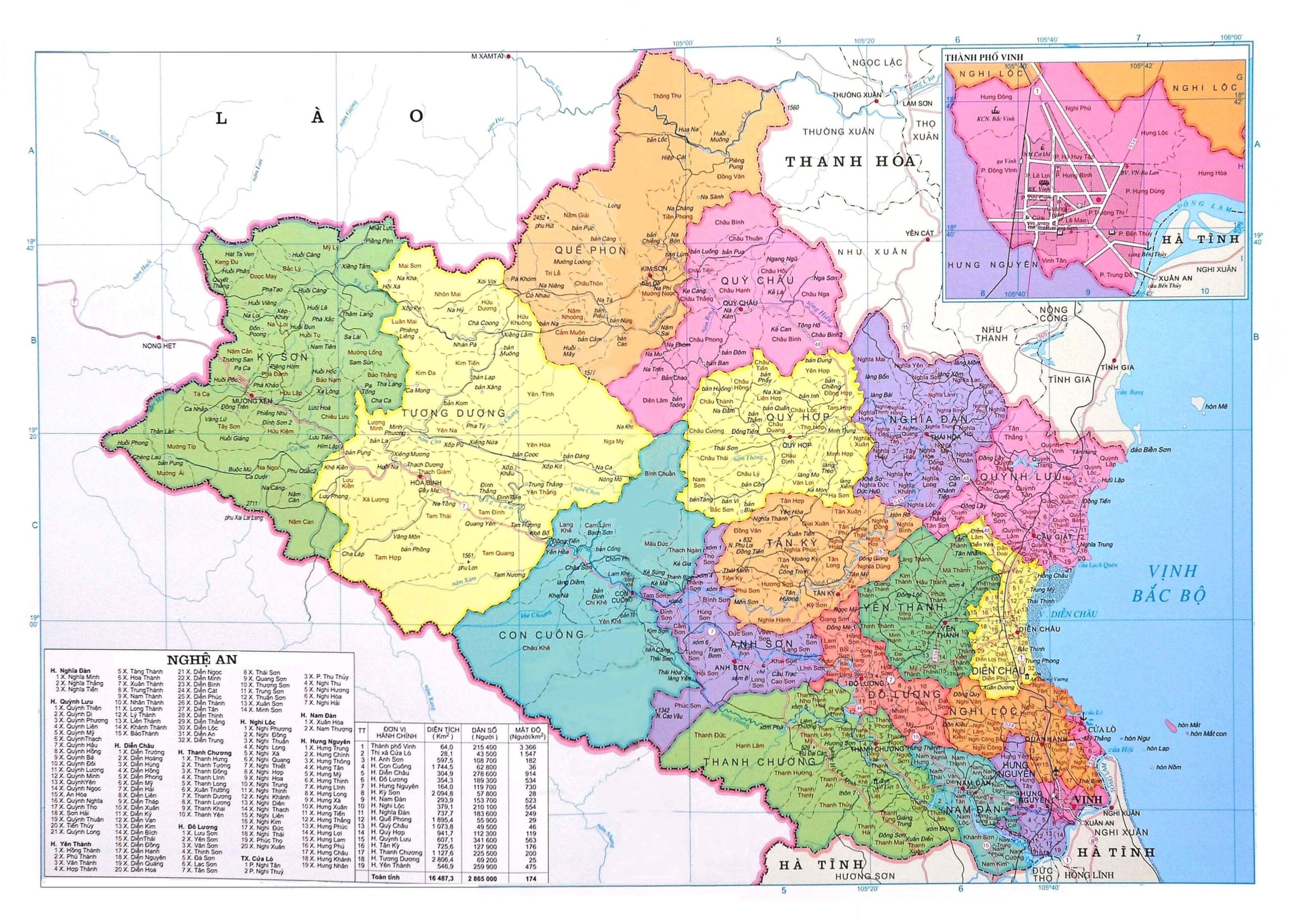 . Home > Bản Đồ Việt Nam > Tỉnh Nghệ An. Phân cấp hành chính, Diện tích (KM2), Các công ty quan trọng. TP. Vinh. TX. Cửa Lò. TX. Thai Hòa.